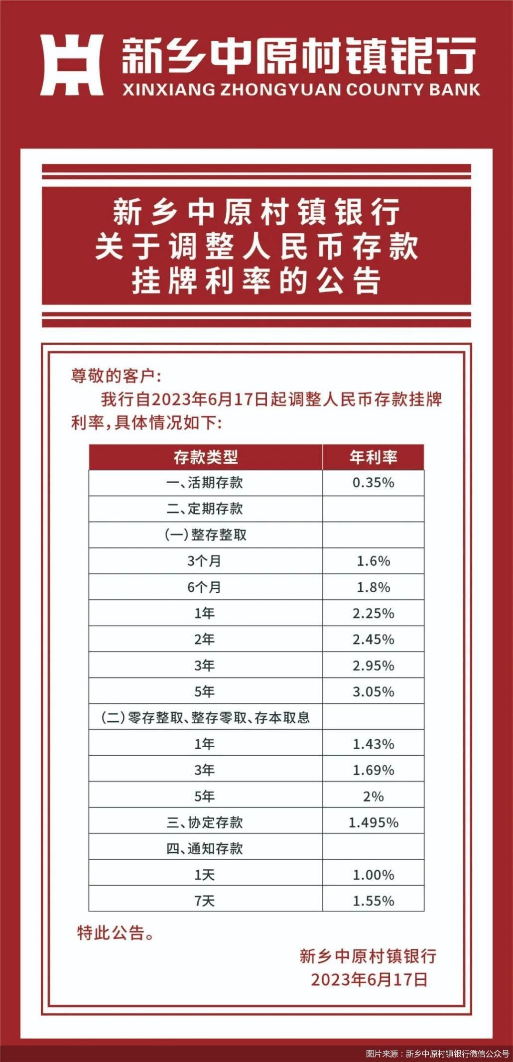 新乡中原村镇银行调整后的整存整取定期存款利率1年期、2年期、3年期、5年期分别为2.25%、2.45%、2.95%、3.05%,据该行网点一工作人员介绍,“我行1年期定期存款利率暂未进行调整,此次调整幅度较大的是2年期、3年期、5年期整存整取定期存款利率,在此之前分别为2.85%、3.3%、3.5%,目前储户存款以挂牌利率为准”。
