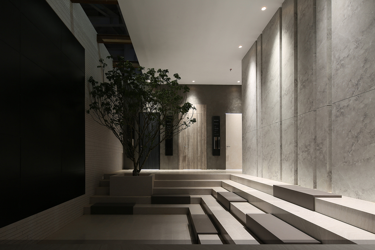 以“绎·境”为主题,拜勒尼用围合院落的手法构建了一座时尚感满满的现代庭院,巧妙实现了内外空间的过渡与转换,融合“流光”“水镜”“树影”“芒草”等一系列自然元素,透视出拜勒尼在都市生活与自然环境关系之间的思考。在建筑与陈设方面,样板展示区、门板展示区、墙板展示区等功能分区以“回”字型路线设计进行串连,拜勒尼的产品低调而别致地融于各个空间环境。