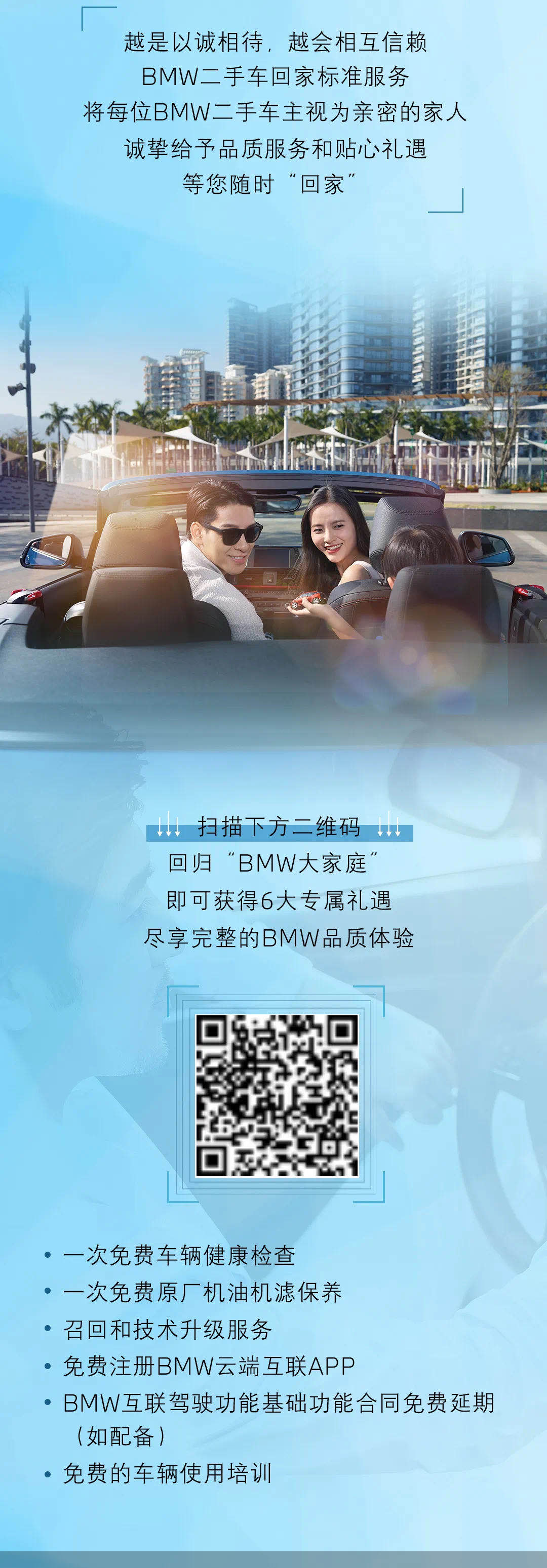 值得一提的是,“回家”的BMW二手车主,在享受六重回归礼遇的同时,还将开启BMW完整体验。其一,开启价值服务体验,包括享受BMW长悦保养回馈计划,专业养护体验与更低保养费用并驾齐驱;其二,开启便捷服务体验,包括BMW免费上门取送车服务,足不出户即可送爱车出门保养;其三,开启数字化服务体验,包括BMW微信服务号便捷服务,服务预约更便捷;其四,开启关爱服务体验,包括BMW终身免费事故救援服务,BMW 24小时待命;其五,开启质量服务体验,包括只提供原装BMW配件的BMW售后服务。