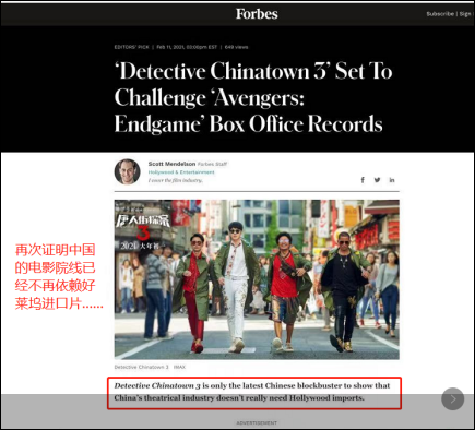 福布斯杂志则发文称,“《唐探3》真的很不错,用IMAX镜头呈现的动作喜剧,有着这个系列独有的大片魅力。”“《唐探3》再次证明中国的电影院线已经不再依赖好莱坞的进口片……”,中国的原创电影IP,中国人自己的故事,正在被世界看到。