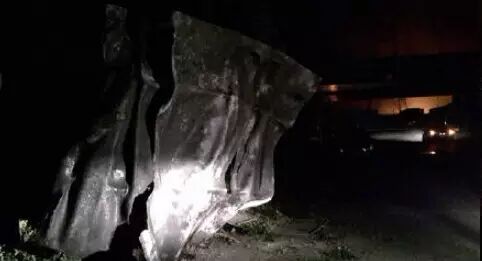 工地上一块两厘米厚两米多高的钢板被冲击气流碾成乌黑的“海带”状。海滨高速桥下停靠的大卡车、公交车玻璃门窗全部震碎,车辆损毁,满地是破碎的玻璃碴。