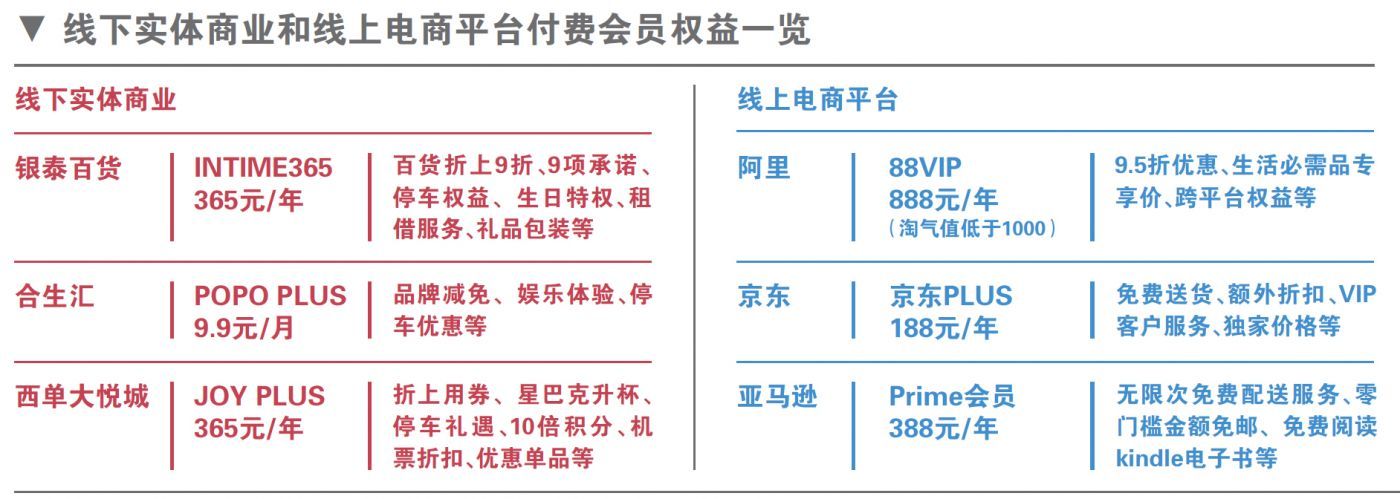 付费会员功能不止活跃在购物中心中,目前业内已经有不少这种付费会员卡的做法,如京东推出的plus会员、亚马逊中国推出的Prime会员、阿里推出的“88VIP”付费会员等,付费会员身份往往对应有商品优惠价格或者其他增值服务及优惠。在业内人士看来,商家做付费会员无非是希望能够借助这一手段来提高用户黏性,并借助会员数据对平台进行转型。