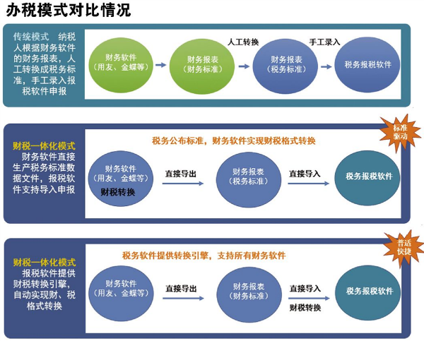 而财税一体化模式下,企业端和税务端报表实现实时转换,完成网上办税系统的对接,纳税人只需要简单地导出/导入,不到3分钟就可以完成工作。标准的财税转换至少提高了申报效率3-5倍,同时避免了纳税人人工转换的理解失误,大大提高了纳税人报税资料的准确性。