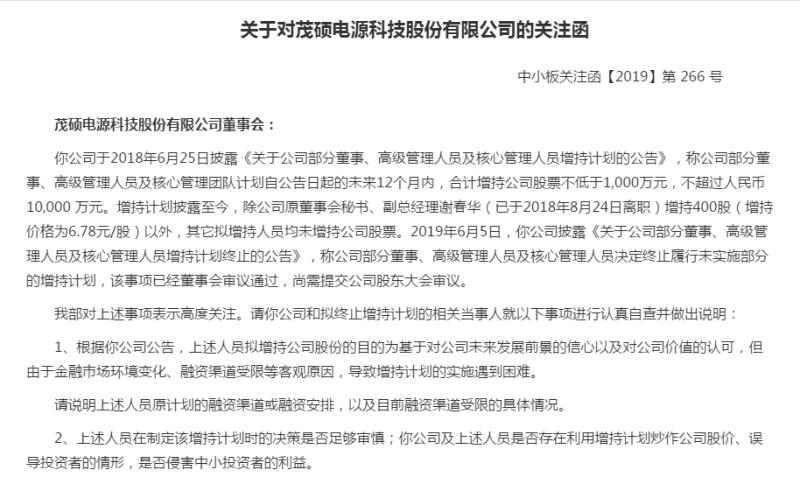 需要指出的是,6月5日晚间,深交所火速向茂硕电源下发关注函,要求茂硕电源说明公司及拟增持人员是否存在利用增持计划炒作公司股价、误导投资者的情形。