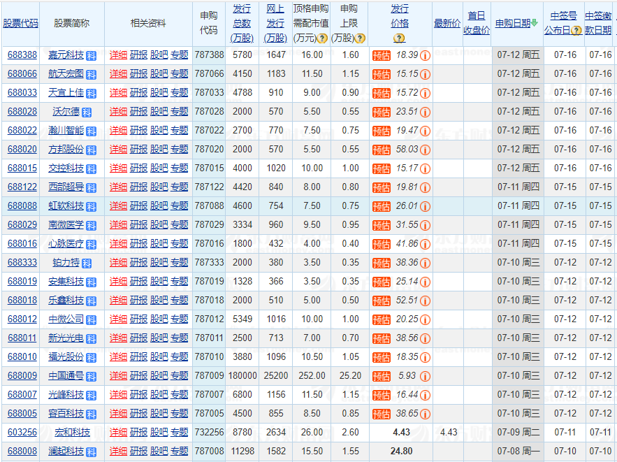 继澜起科技打新之后,7月10日将迎来“打新黄金日”,容百科技、福光股份、安集科技、新光光电、乐鑫科技、中国通号等9家企业集体申购;7月11日有西部超导、虹软科技、南微医学、心脉医疗等4家企业申购;7月12日则有天宜上佳、沃尔德、瀚川智能等7股进行申购。