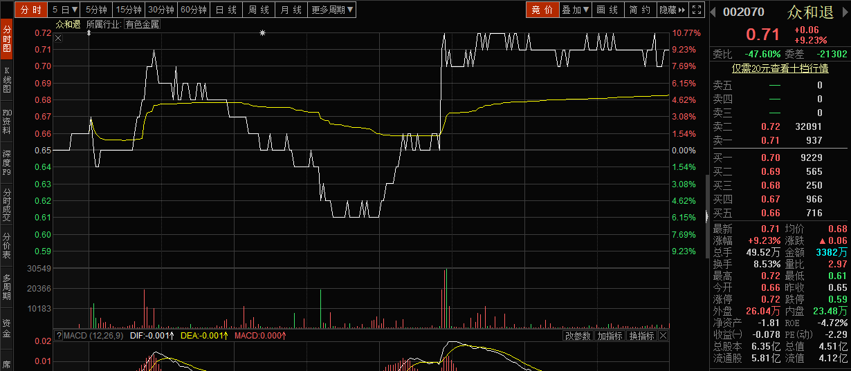 交易行情显示,众和退7月8日高开1.54%,开盘价0.66元/股,之后公司股价在早盘先后经历了一波上涨、下跌行情,当日午间收盘公司股价收跌6.15%。但在午后开盘,众和退股价开始不断拉升,在下午1点26分众和退出现一笔141万元的大笔买单,公司股价直线拉升触及涨停,随后公司股价便在高位保持震荡走势,截至当日收盘,众和退收于0.71元/股,涨幅达9.23%,当日换手率达8.53%,成交金额3382万元。