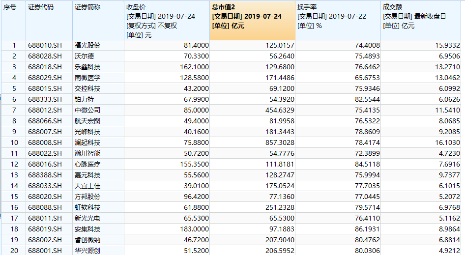 排在中国通号之后的则为澜起科技,公司7月22日-24日这三个交易日累计成交额达79.52亿元;此外,中微公司、南微医学两家公司在7月22日-24日三个交易日的累计成交额也均在50亿元以上,分别为57.09亿元、51.05亿元。