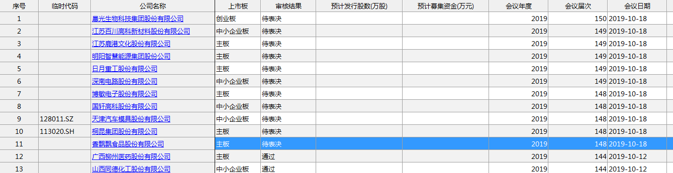 具体来看,第十八届发审委2019年第148次工作会议将审议国轩高科股份有限公司、桐昆集团股份有限公司、天津汽车模具股份有限公司、香飘飘、博敏电子股份有限公司5家公司的可转债申请。同日,第十八届发审委2019年第149次工作会议也将审议5家上市公司的可转债申请,包括江苏鹿港文化股份有限公司、江苏百川高科新材料股份有限公司、深南电路股份有限公司、明阳智慧能源集团股份有限公司、日月重工股份有限公司。