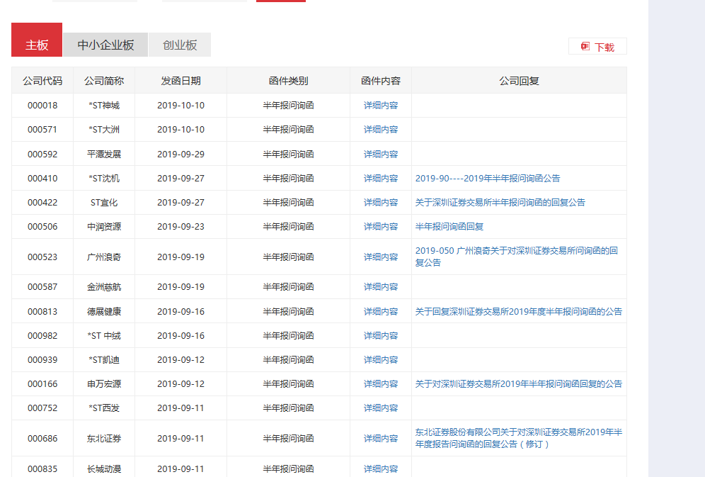 进入10月,上市公司半年报问询函仍在密集下发中,经统计,截至10月15日,沪深两市已有109股的半年报遭到交易所的问询,而在去年全年,仅71股收到了半年报问询函。经计算,今年年内收到半年报问询函的个股较去年全年增超五成。需要指出的是,在上述109股中,不乏*ST大洲(000571)、*ST龙力、千山药机等个股2018年半年报就遭到过交易所的问询。此外,与按时回复半年报问询函的个股相比,豫金刚石、*ST利源、獐子岛、长城动漫、*ST西发等多股的半年报问询回复出现“难产”。