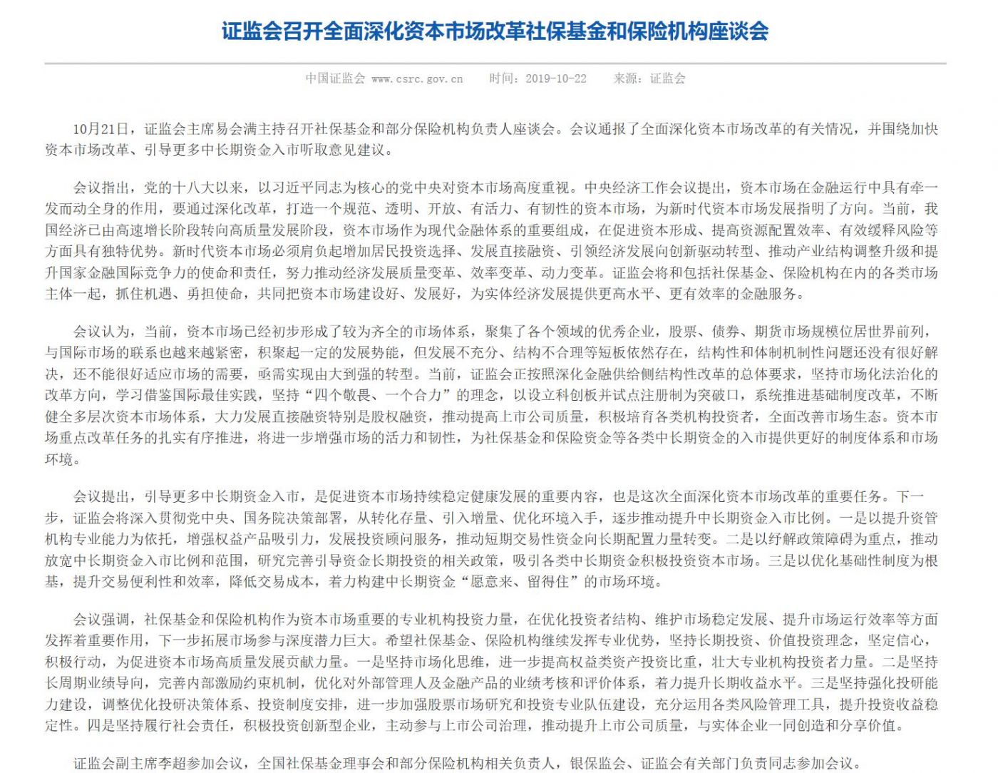 事实上,引导更多中长期资金入市是此次全面深化资本市场改革的重要任务。证监会在今年9月推出的“深改12条”中就明确表态,要推动更多中长期资金入市,放宽各类中长期资金入市比例和范围。