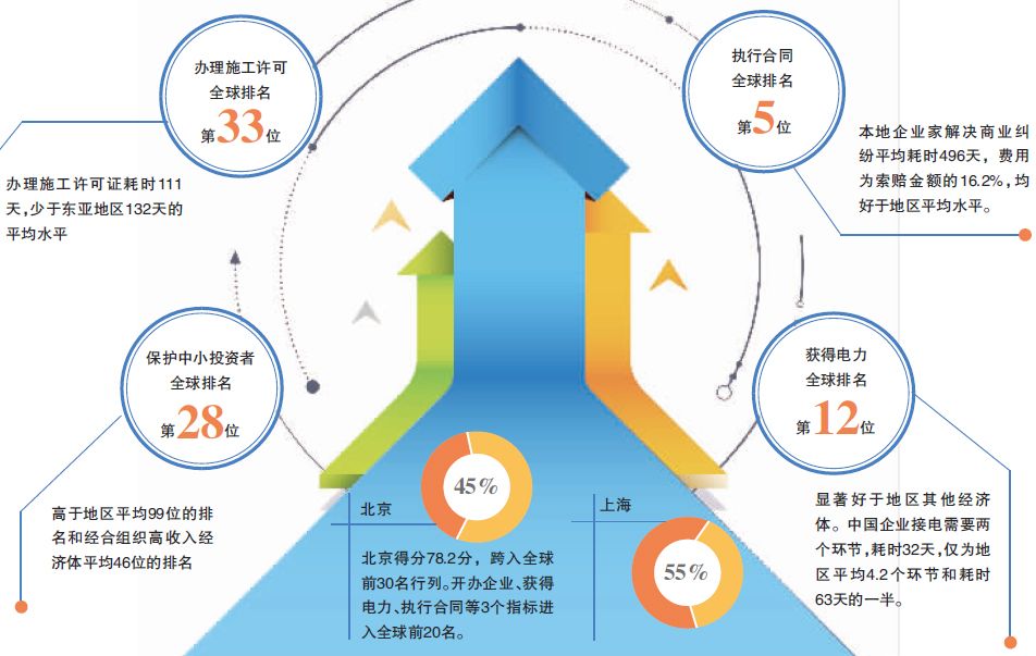 作为样本城市之一,北京市的得分也连续两年大幅提升。今年得分为78.2分,跨入全球前30名行列。其中,开办企业、获得电力、执行合同等3个指标进入全球前20名。