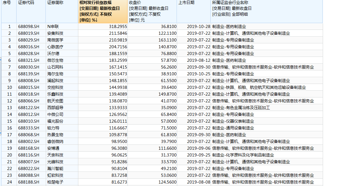 经统计计算,截至10月28日,36股最新收盘价较发行价涨幅最大的是申联生物。不过申联生物于10月28日刚刚上市。根据相关规则,科创板股票上市前5个交易日不设涨跌幅限制。同时,于10月25日上市的海尔生物也适用前述规则。