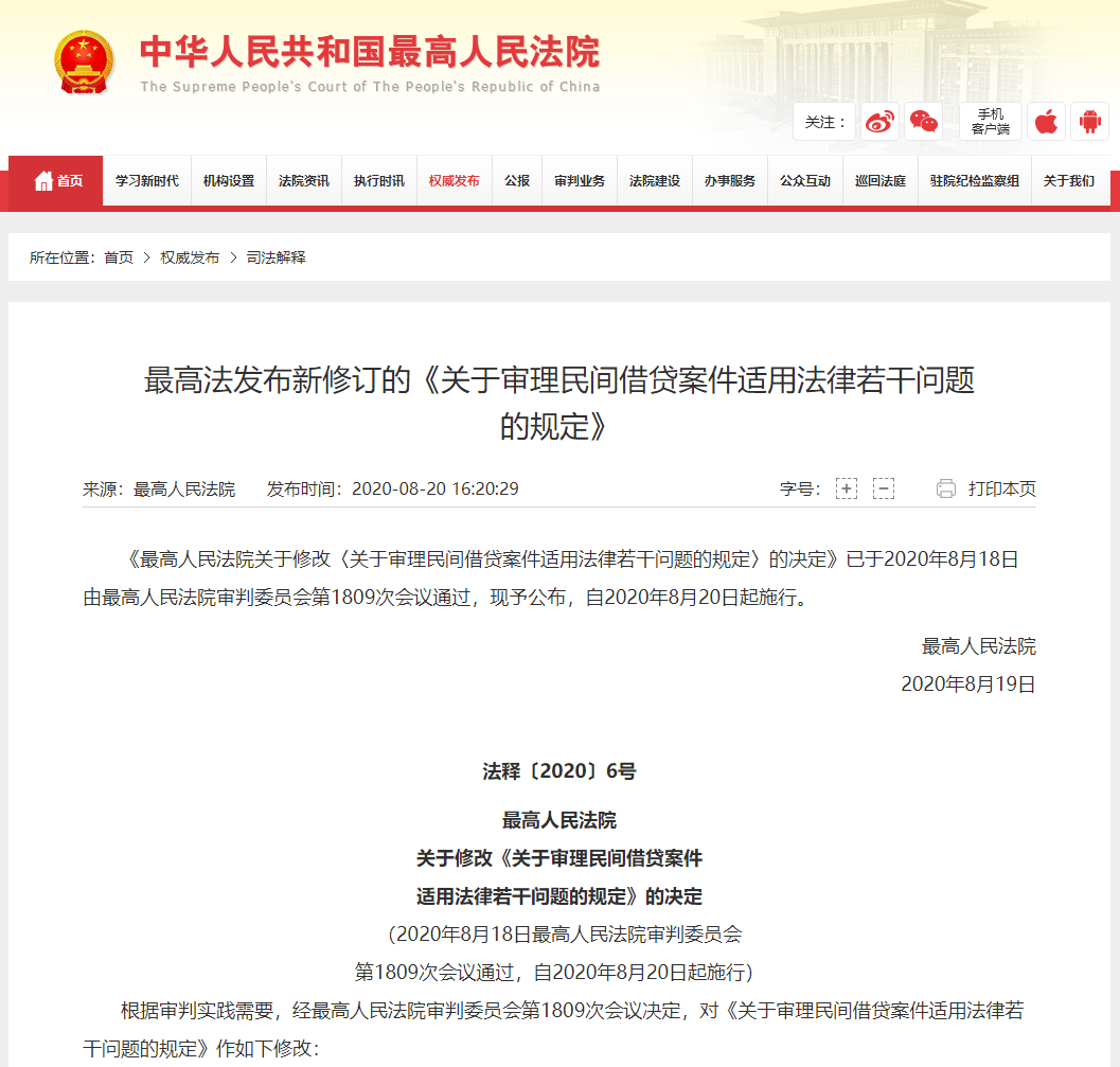 8月20日,最高人民法院召开新闻发布会,明确对民间借贷利率的司法保护上限进行调整。具体为:以央行授权全国银行间同业拆借中心每月20日发布的一年期贷款市场报价利率(LPR)的4倍为标准确定民间借贷利率的司法保护上限,取代原《规定》中“以24%和36%为基准的两线三区”的规定。