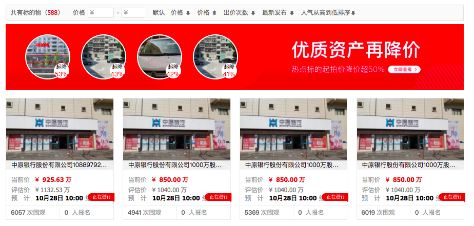在“一波三折”的拍卖失败后,目前进入变卖程序的上述4笔中原银行股权均吸引了5000-6000次围观,但尚未有人报名。
