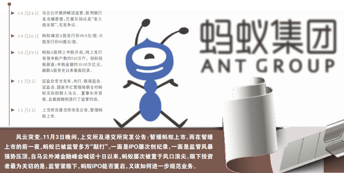 风云突变。11月3日晚间,上交所及港交所突发公告:暂缓蚂蚁上市。而在暂缓上市的前一夜,蚂蚁已被监管多方“敲打”。一面是IPO屡次创纪录,一面是监管风暴强势压顶,自马云外滩金融峰会喊话十日以来,蚂蚁屡次被置于风口浪尖。眼下投资者最为关切的是,监管紧箍下,蚂蚁IPO能否重启,又该如何进一步规范业务。