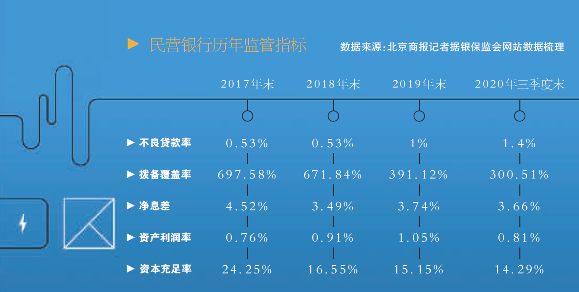 与2017年末的数据纵向对比来看,民营银行资产质量呈现了恶化趋势,抵御风险能力大幅下降,截至2020年三季度末,民营银行1.4%的不良贷款率,较2017年末的0.53%上升0.87个百分点;300.51%的拨备覆盖率较2017年末697.58%的指标下降了379.07个百分点。