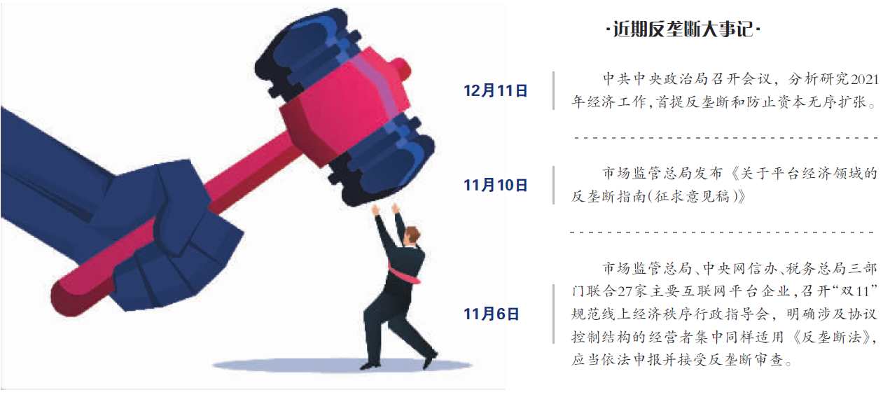 12月14日,市场监管总局对阿里巴巴收购银泰商业、阅文集团收购新丽传媒、丰巢收购中邮智递3起未依法申报违法实施经营者集中案进行了处罚。3家公司分别被处以50万元人民币罚款的行政处罚。就在上周五,政治局会议首次明确表示,要强化反垄断和防止资本无序扩张。这是自《反垄断法》生效以来,中共中央政治局首次明确表示强化反垄断。
