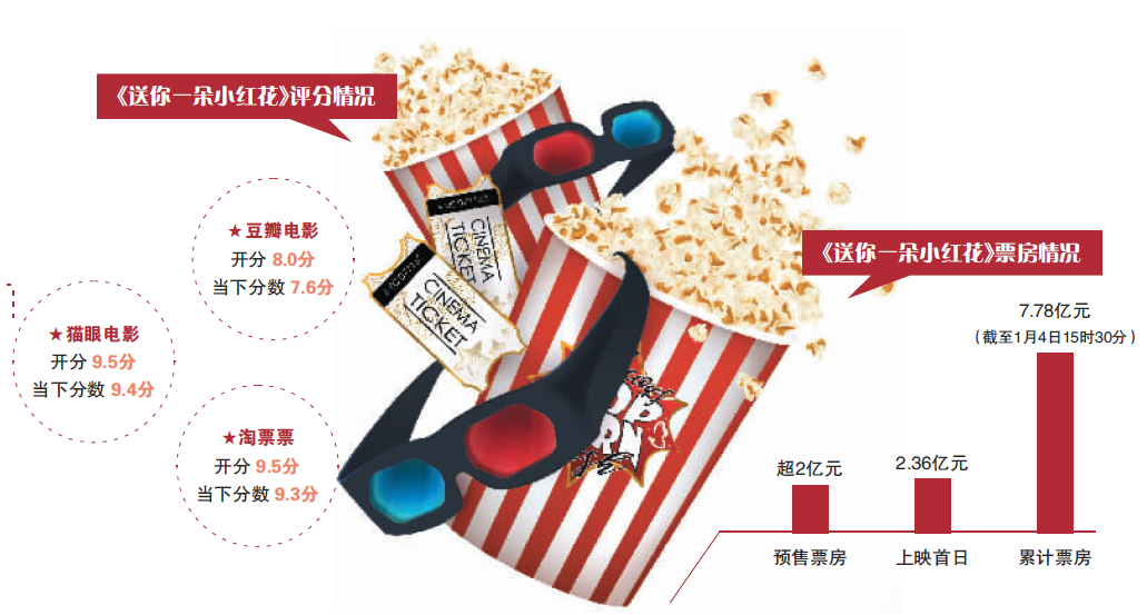 业内人士认为,此次元旦档票房的增长一方面与观众逐步释放观影需求有关,另一方面也是在检验观众对于当下电影作品的认可度。而《送你一朵小红花》的市场表现,既离不开流量的带动,也与部分观众发布的观影反馈带动其他观影群体密不可分。