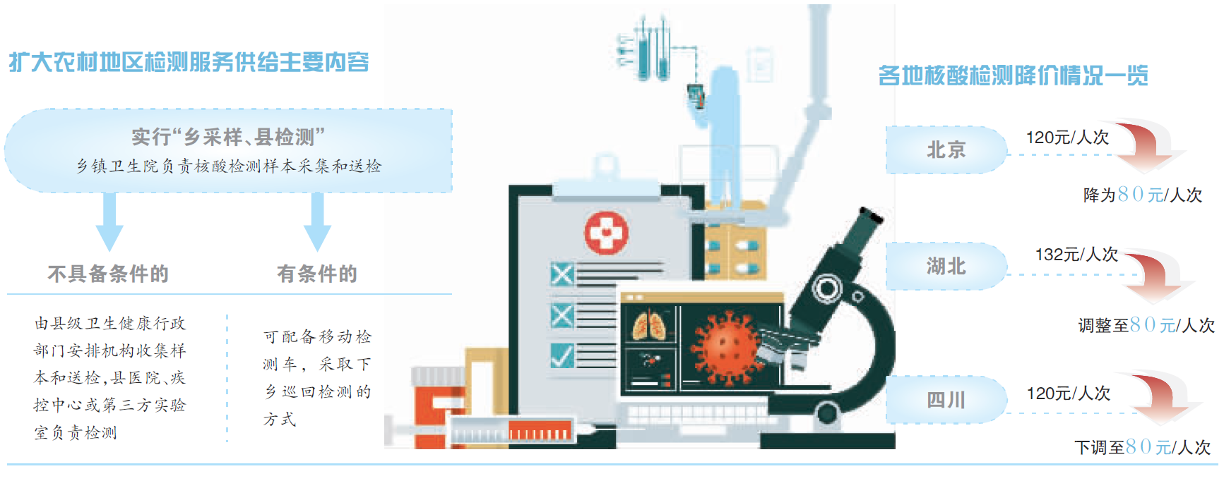 《通知》指出,扩大农村地区检测服务供给,各地要及时开展样本采集和核酸检测,实行“乡采样、县检测”,乡镇卫生院负责核酸检测样本采集和送检,不具备条件的由县级卫生健康行政部门安排机构收集样本和送检,县医院、疾控中心或第三方实验室负责检测。有条件的地方可配备移动检测车,采取下乡巡回检测的方式,进一步扩大核酸检测服务供给。