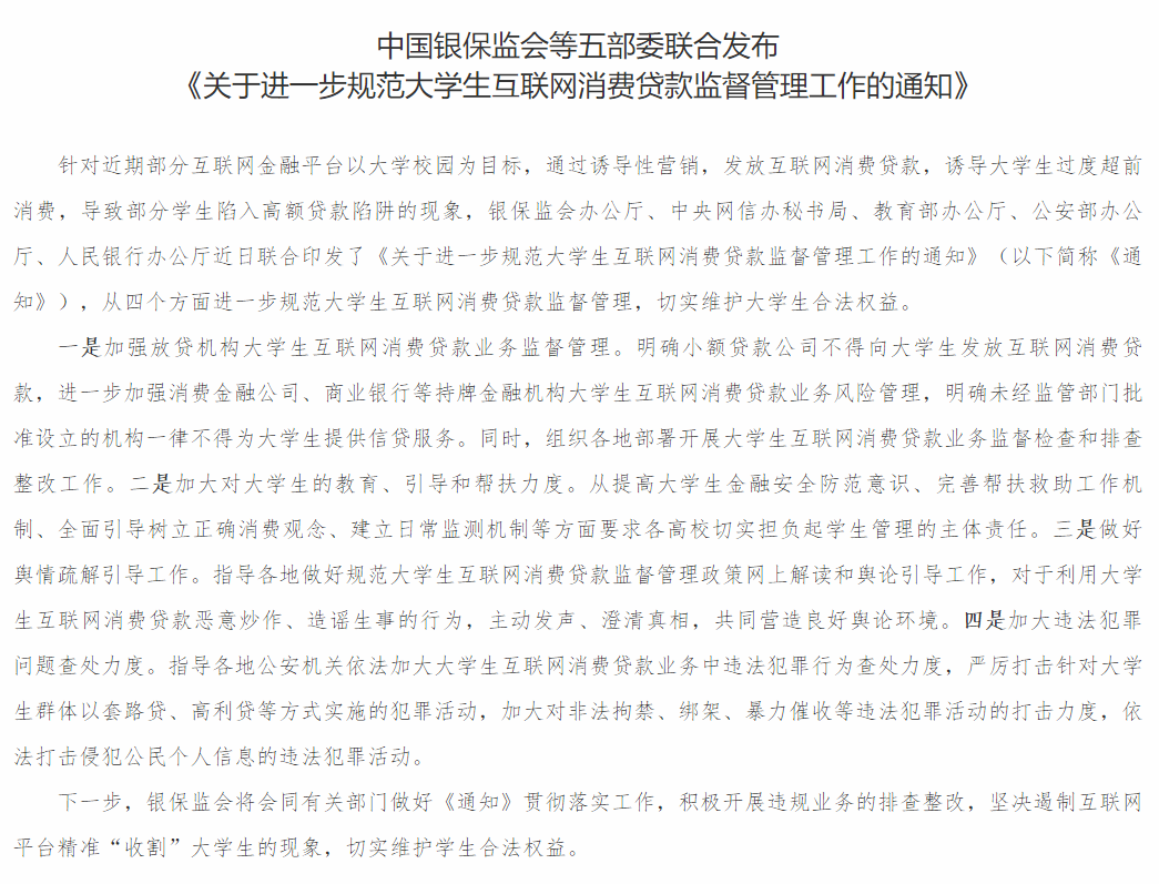 为尽快规范整顿大学生互联网消费贷款乱象,银保监会等五部门出台了《通知》,进一步加强放贷机构客户营销管理和风险防范要求,坚决遏制互联网平台精准“收割”大学生的现象。