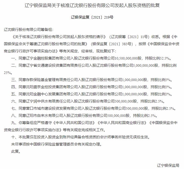 不久前刚获得监管同意筹建后,辽沈银行建设又迎来最新进展。6月1日,辽宁银保监局发布《关于核准辽沈银行股份有限公司发起人股东资格》的批复,同意八家机构入股辽沈银行。