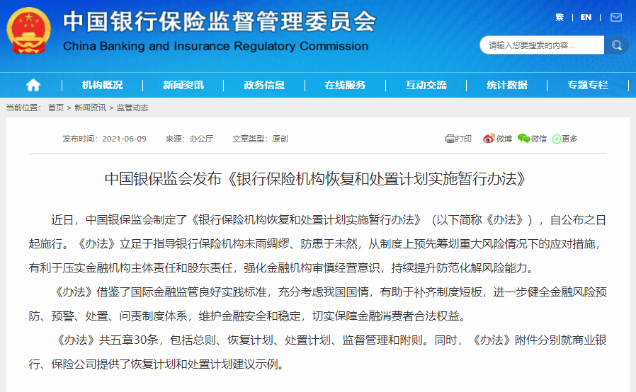 金融机构的恢复与处置计划,被称作“生前遗嘱”。自2011年以来,金融监管部门指导中国银行、工商银行、农业银行、建设银行等机构制定和更新恢复和处置计划,并先后对信托公司、民营银行提出了全面制定恢复和处置计划的监管要求。为了充分借鉴国际监管良好实践,及时总结防范和化解金融风险攻坚战的有益经验,银保监会制定了《办法》。