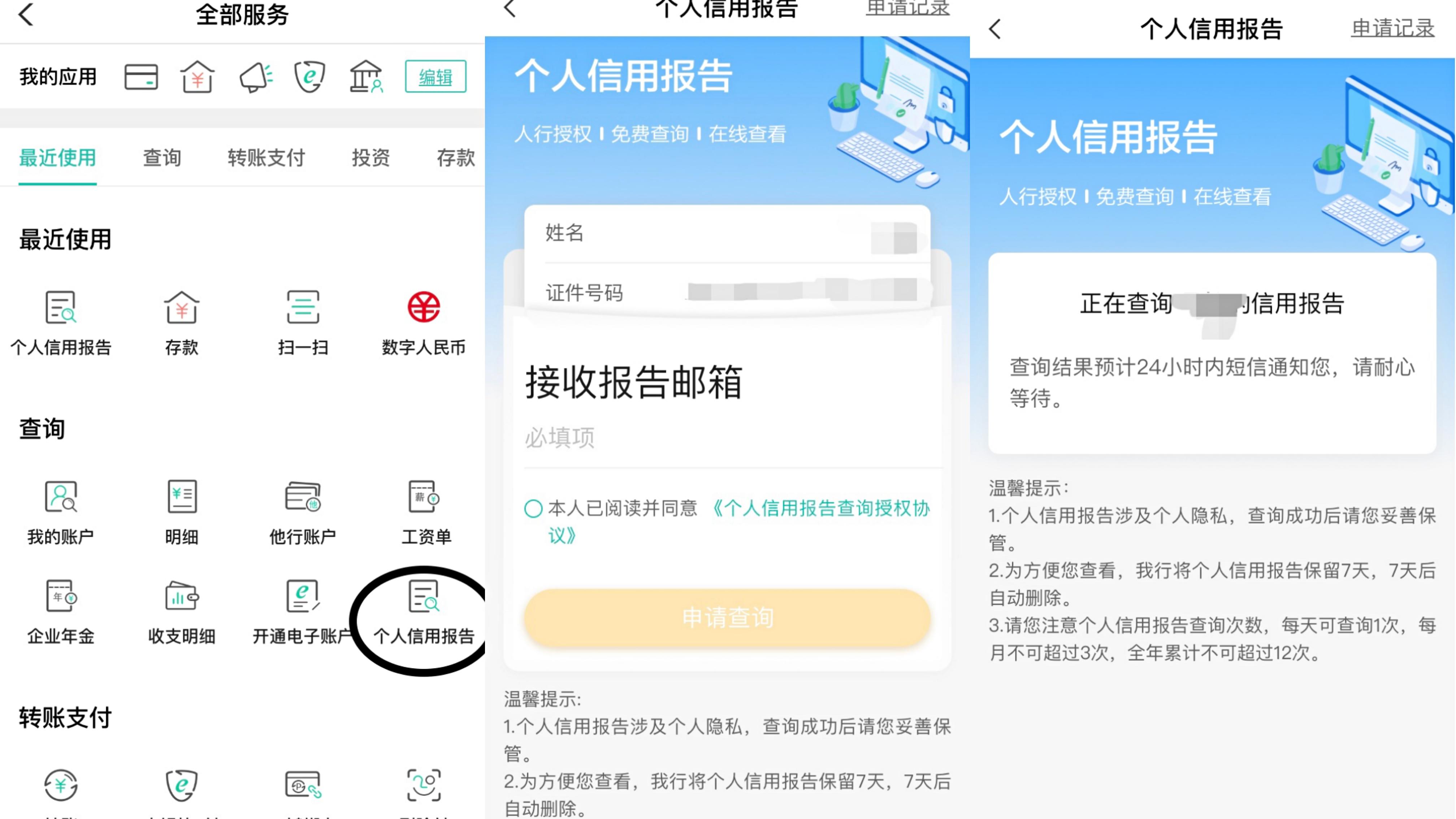 而随着银行业数字化转型的推进,已经有多家商业银行开通了手机银行查询个人征信报告功能,操作步骤十分便捷,以农行App为例,只需登录农行App,点击“全部”,在“查询”模块里面找到“个人信用报告”功能,录入查询申请的个人信息及邮箱,同意授权,输入短信验证码,再进行人脸识别就可以免费查询了,北京商报记者实测整个过程仅用了1-2分钟,非常方便。