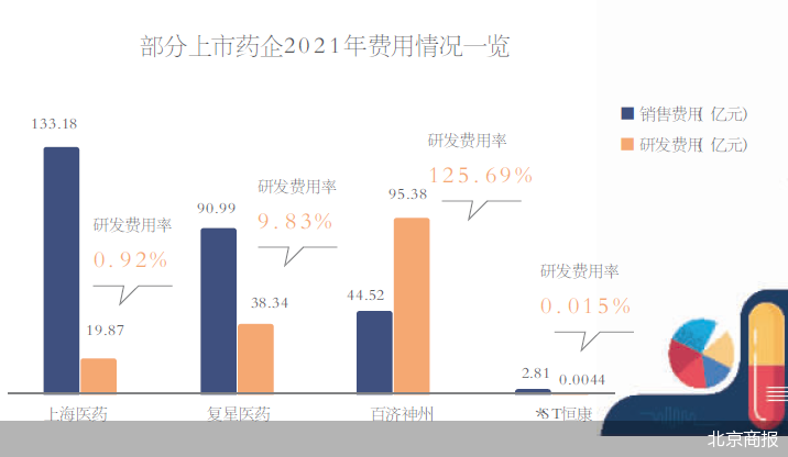 北京商报记者注意到,如*ST恒康、信邦制药等个股2021年出现了销售费用远高于研发费用的情况。