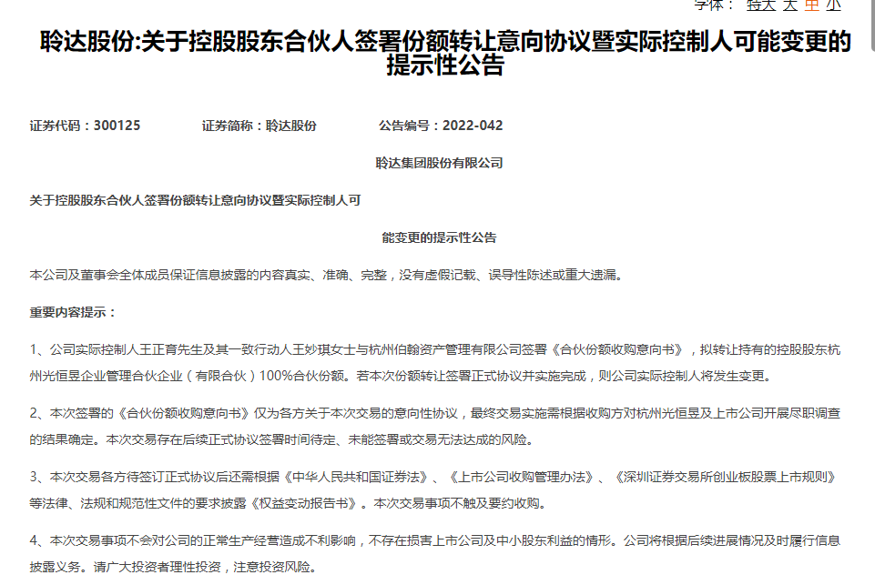 聆达股份表示,公司收到控股股东杭州光恒昱的通知,杭州光恒昱合伙人王正育及王妙琪于5月15日与杭州伯翰签署了《合伙份额收购意向书》,杭州伯翰及/或其指定主体/人士(以下合称“收购方”)拟受让王正育、王妙琪持有的杭州光恒昱100%合伙份额,以实现收购方通过杭州光恒昱持有聆达股份22.02%的股份进而间接控制上市公司。