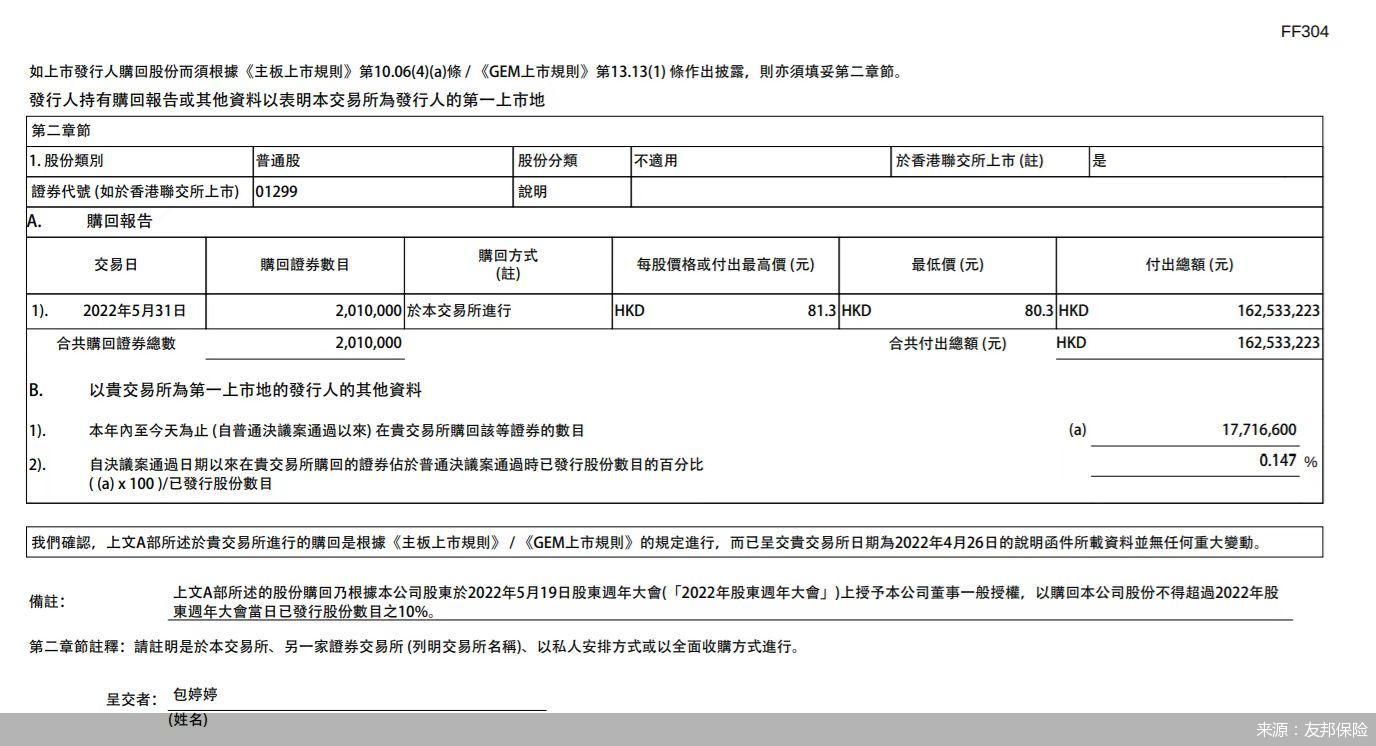 友邦保险:5月31日回购201万股,耗资1.63亿港元