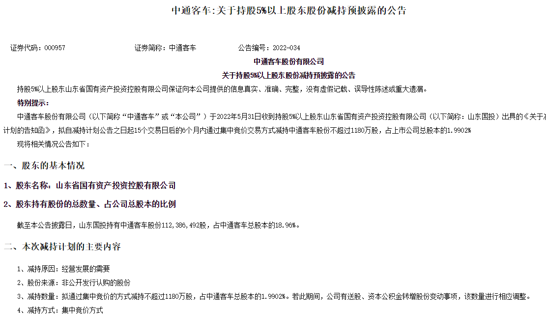 截至公告披露日,山东国投持有中通客车股份1.12亿股股份,占中通客车总股本的18.96%。对于减持原因,中通客车表示,股东经营发展需要。