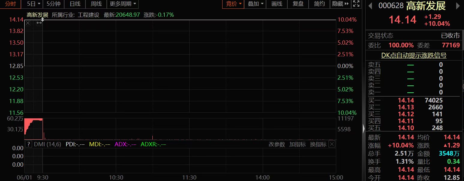 交易行情显示,6月1日,高新发展以涨停开盘,并一直维持涨停状态直至收盘,全天封死涨停板,最终收于涨停价14.14元/股,涨幅为10.04%,总市值为49.81亿元。