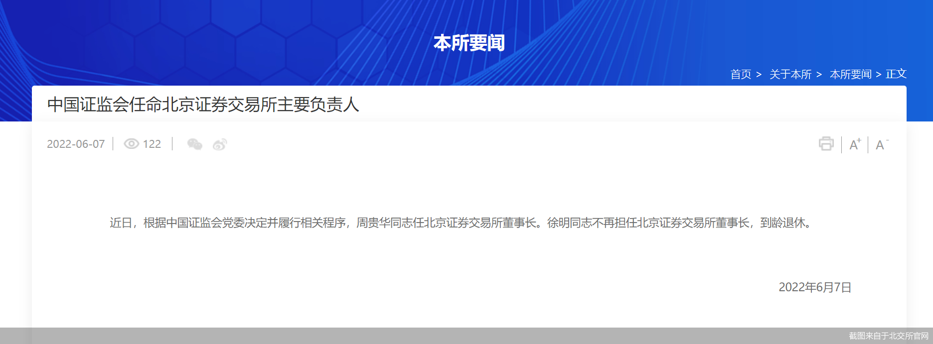 6月7日晚间,北交所官网显示,近日,根据中国证监会党委决定并履行相关程序,周贵华任北交所董事长、全国股转公司董事长。徐明不再担任北交所董事长、全国股转公司董事长,到龄退休。