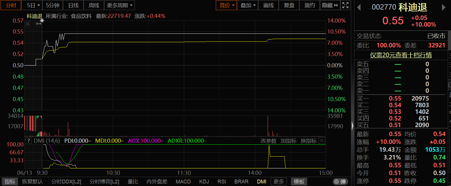 以科迪退为例,交易行情显示,6月13日,科迪退股价高开高走,开盘价为0.51元/股,涨幅为2%,开盘后不久,科迪退股价迅速拉升并封上涨停,此后一直维持涨停状态直至收盘。截至6月13日收盘,科迪退报0.55元/股,涨幅为10%,总市值为6.02亿元。