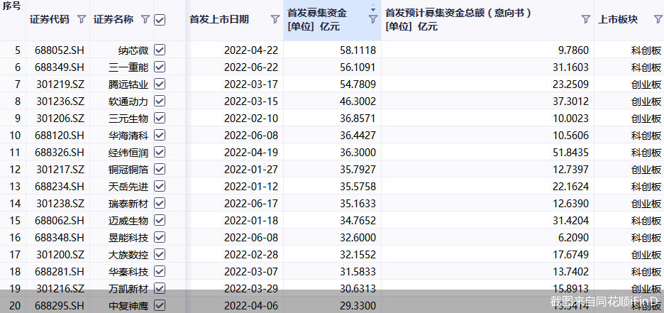 募资额在50亿-100亿元之间的还有翱捷科技、纳芯微、三一重能、腾远钴业等4股,分别募资68.83亿元、58.11亿元、56.11亿元、54.78亿元;募资额在10亿-50亿元之间的则有青木股份、华康医疗、海创药业等70股;剩余个股募资额均在10亿元以下。