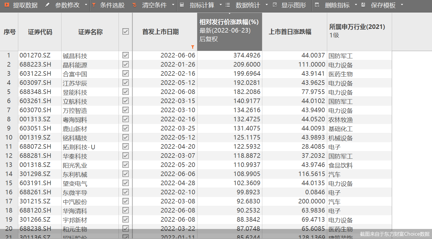 其他年内上市新股的股价表现也同样值得关注。东方财富Choice数据显示,在年内上市新股中,截至6月23日收盘,有15只个股相对于发行价股价翻倍。
