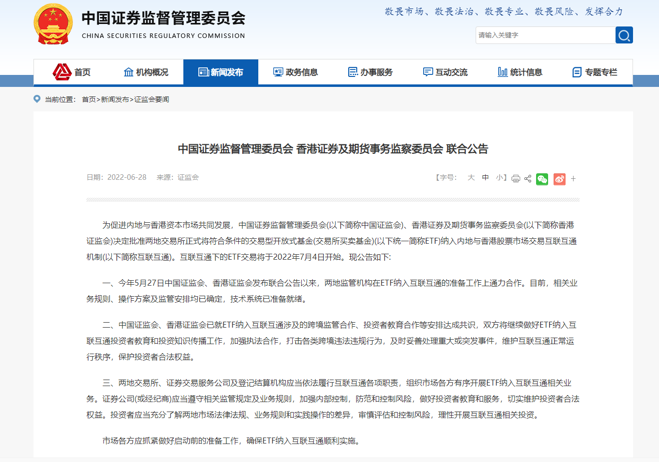 时隔仅一个月,内地与香港ETF互联互通进程即迎来重磅更新。6月28日,中国证监会与香港证监会发布联合公告称,决定批准两地交易所正式将符合条件的ETF纳入内地与香港股票市场互联互通。互联互通下的ETF交易将于2022年7月4日开始。