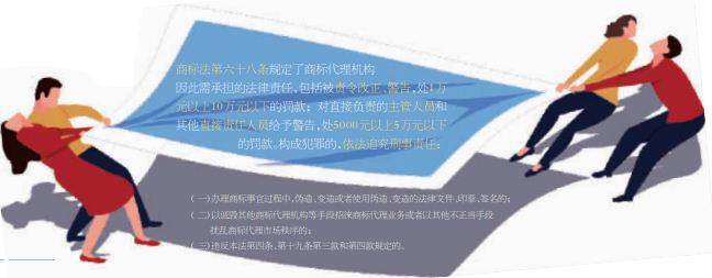 我国商标法第六十八条规定了商标代理机构因此需承担的法律责任,包括被责令改正、警告,处1万元以上10万元以下的罚款;构成犯罪的,依法追究刑事责任。对直接负责的主管人员和其他直接责任人员给予警告,处5000元以上5万元以下的罚款。