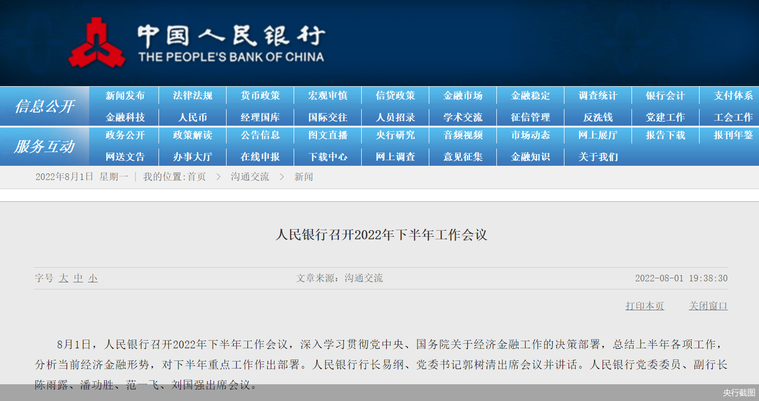 对于货币政策、金融风险处置、平台经济整改,央行再次重磅发声。8月1日,央行召开2022年下半年工作会议,总结上半年各项工作,分析当前经济金融形势,并对下半年重点工作作出部署。