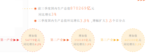 前三季度的GDP,分产业看,第一产业增加值54779亿元,同比增长4.2%;第二产业增加值350189亿元,增长3.9%;第三产业增加值465300亿元,增长2.3%。