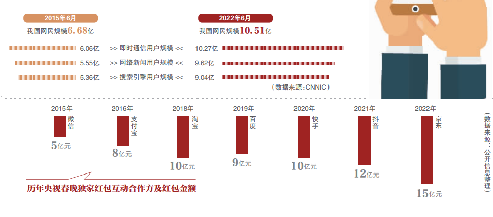理解春晚红包的意义,要回到2014年春节,微信上线红包功能“偷袭珍珠港”支付宝,次年微信登上央视春晚舞台,花5亿元请全球华人“摇一摇”,再挫支付宝锐气。成功的样板,全民的记忆,红包几乎成了央视春晚一个时代的标配,BAT(百度、阿里、腾讯)、快手、抖音、京东轮番登场,一举将红包金额从5亿元拉到15亿元。