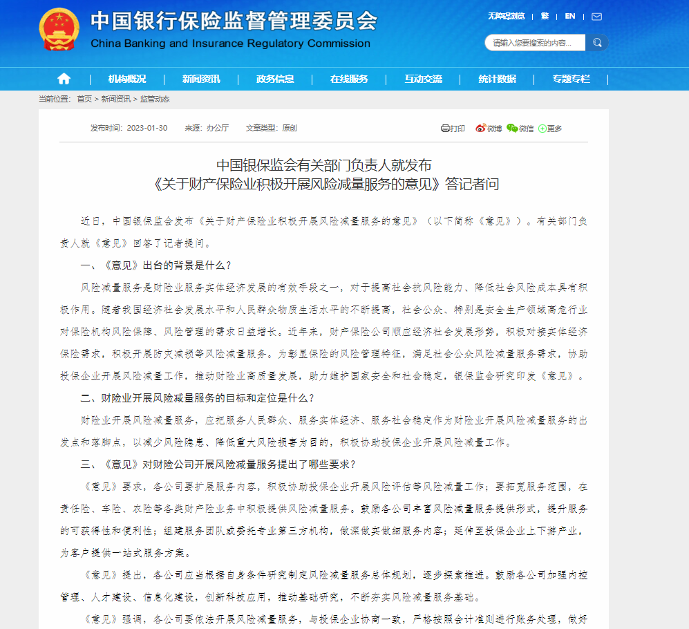 北京商报讯(记者 陈婷婷 胡永新)1月30日,银保监会官网发布信息显示,为彰显保险的风险管理特征,满足社会公众对财险业风险减量服务的需求和期盼,推动风险减量服务高质量发展,近日中国银保监会发布《关于财产保险业积极开展风险减量服务的意见》(以下简称《意见》)。