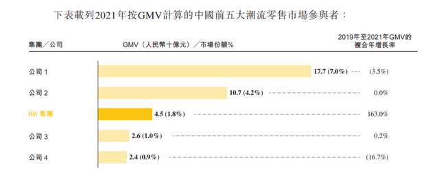 据统计,按GMV(成交总额)计算,2021年中国潮流零售市场前五大参与者的总市场规模为379亿元,占国内总数的约14.9%。其中,KK集团是2021年中国三大潮流零售商之一,旗下拥有KK馆、KKV、THE COLORIST调色师、X11四个连锁零售品牌,是前十大市场参与者中增长最快的潮流零售商,2019年至2021年GMV的复合年增长率为163.0%。