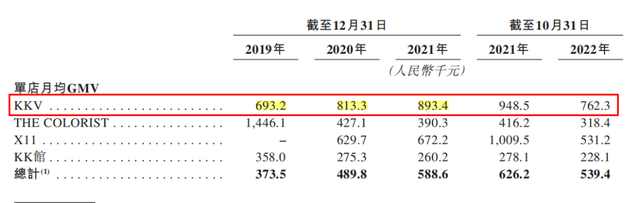 之所以盈利能力能不断提升,必然绕不开单店模型。更新后的招股书首次公开了集团旗下四大品牌的单店营收能力。从门店运营效益来看,四大品牌均处于较为稳定的水平。以占比近7成的KKV为例。KKV单店月均GMV从2019年的69.32万元逐年提升至2020年81.3万元及2021年的89.34万元,并在2021年前十月达到94.85万元的新高,而2022年前十月因行业整体压力降至76.23万元但依然高于2019年水平。
