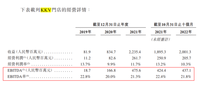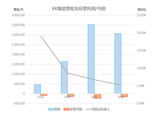 要看整体盈利状况,选取经营亏损这一指标更为直观。2019、2020、2021及2022年前十月,经营利润分别为-0.88亿元、-1.425亿元、-2.375亿元及-1.596亿元。对应到在营收中的占比,会发现KK集团的亏损率正呈逐年显著下降的趋势,分别为-19%、-8.66%、-6.74%、-5.2%。