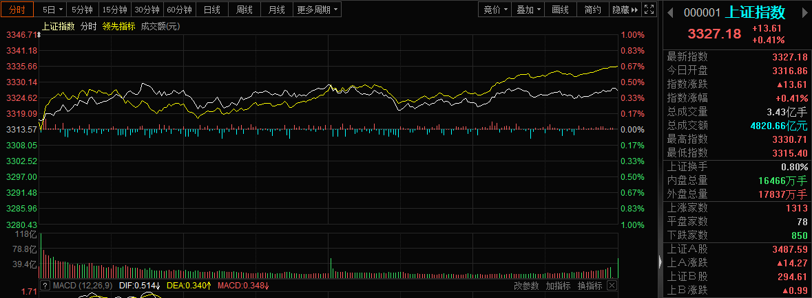 北京商报讯(记者 马换换)4月12日,A股三大股指开盘涨跌不一,截至当日收盘,上证综指收涨0.41%,报3327.18点;深证成指收涨0.05%,创业板指收跌0.41%。