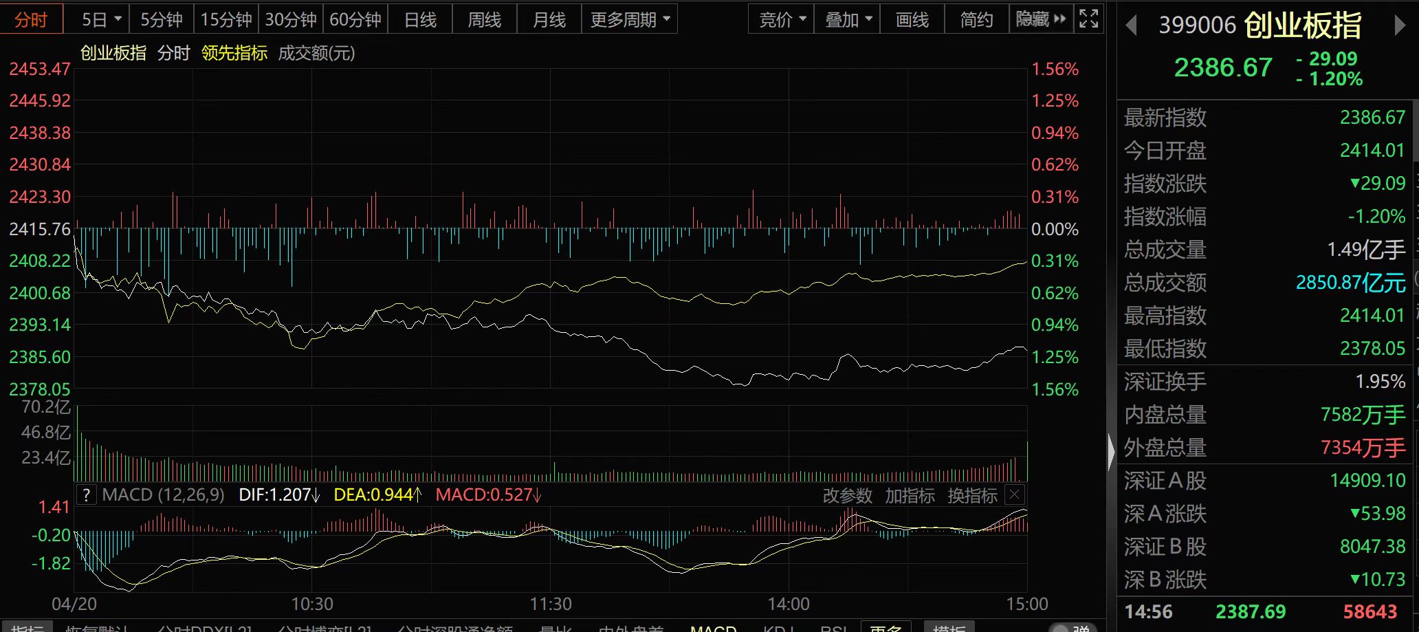 北京商报(记者 丁宁)4月20日,A股三大股指集体收跌,上证综指收跌0.09%,深证成指收跌0.37%,创业板指收跌1.2%。