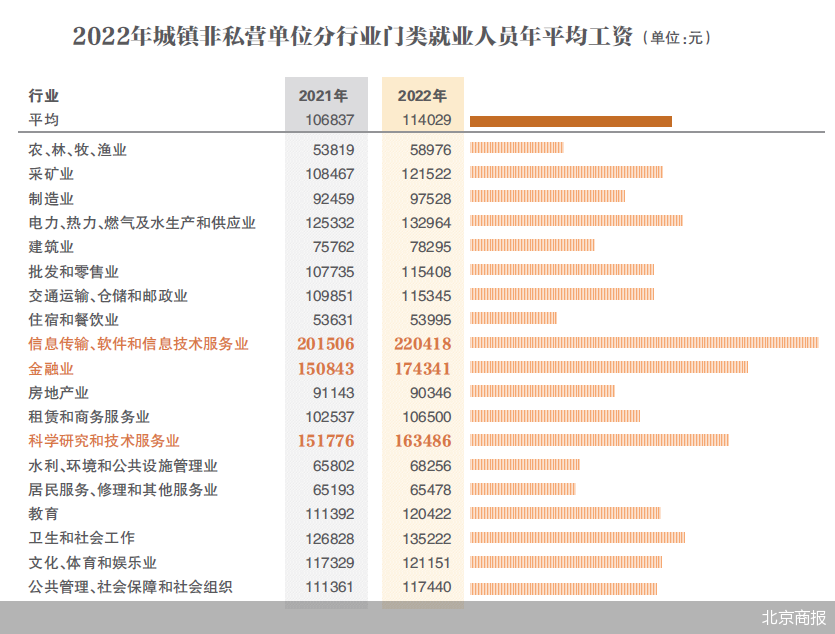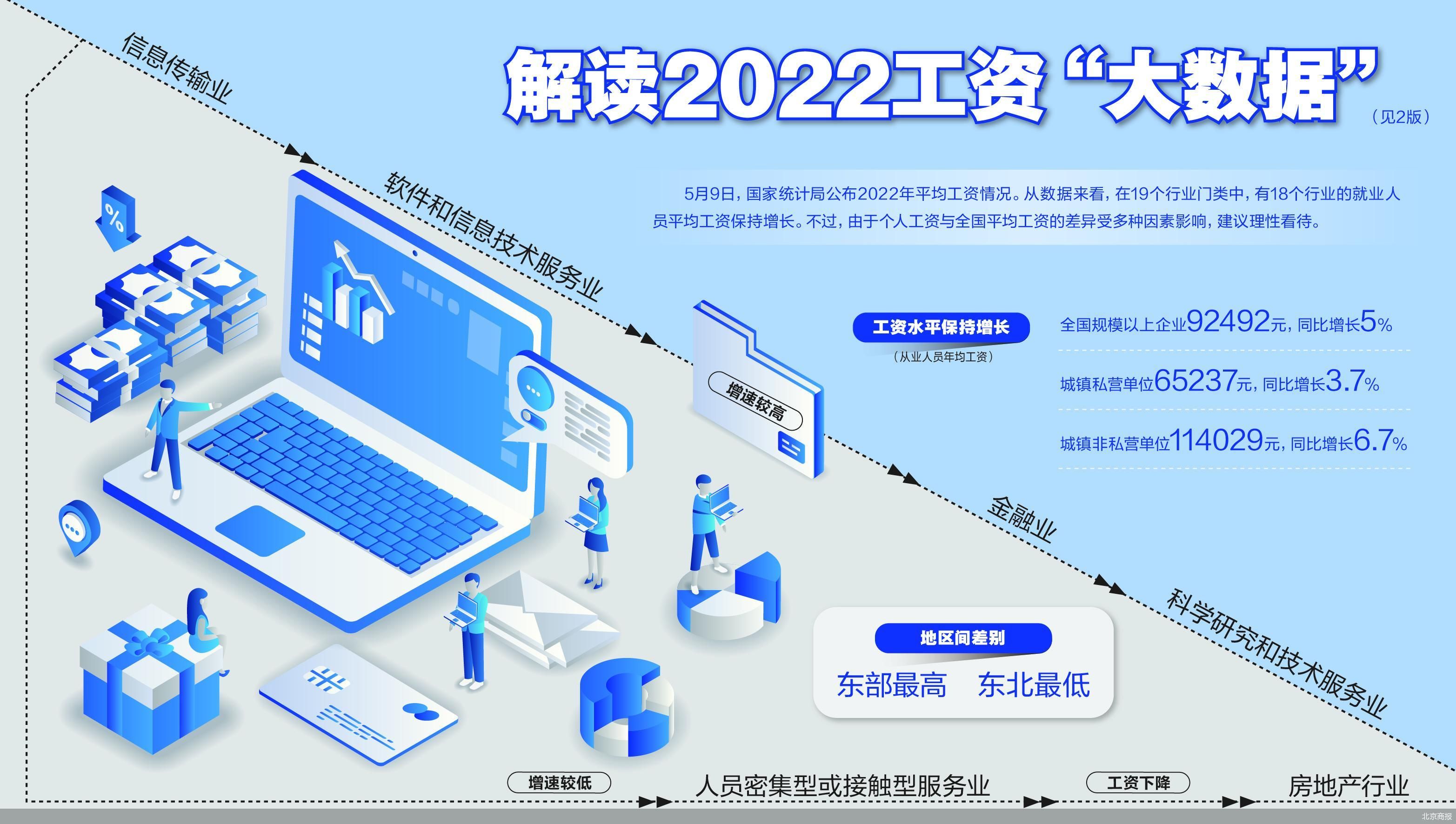 5月9日,国家统计局公布2022年平均工资情况。从数据来看,在19个行业门类中,有18个行业的就业人员平均工资保持增长。其中,无论是在城镇非私营单位还是在私营单位中,就业人员年平均工资水平排在前三位的行业均为技术含量较高的信息传输、软件和信息技术服务业,金融业,科学研究和技术服务业。此外,金融业平均工资增速最高。对于个人工资与全国平均工资存差异的情况,建议理性看待。