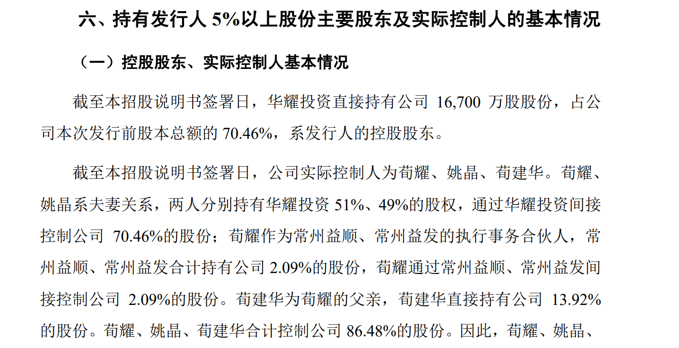截至招股说明书签署日,华耀光电实控人为荀耀、姚晶、荀建华,三人合计持有华耀光电86.48%股份。其中荀耀、姚晶通过华耀投资控制公司70.46%股份;荀耀通过常州益顺、常州益发间接控制公司2.09%股份;荀建华直接持有公司13.92%的股份。