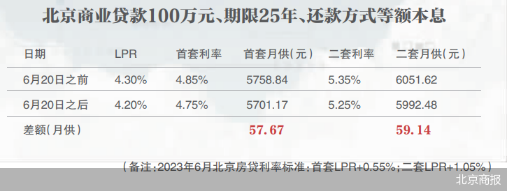 值得一提的是,本次5年期LPR下调也关乎所有购房者的月供。据北京商报记者测算,在等额本息计算方式下,以北京地区商贷100万元25年期为例,此次LPR调降10个基点后,首套每月月供可少还57.67元左右,二套每月可省59.14元,25年内整体可省下1.73万-1.77万元的利息支出。